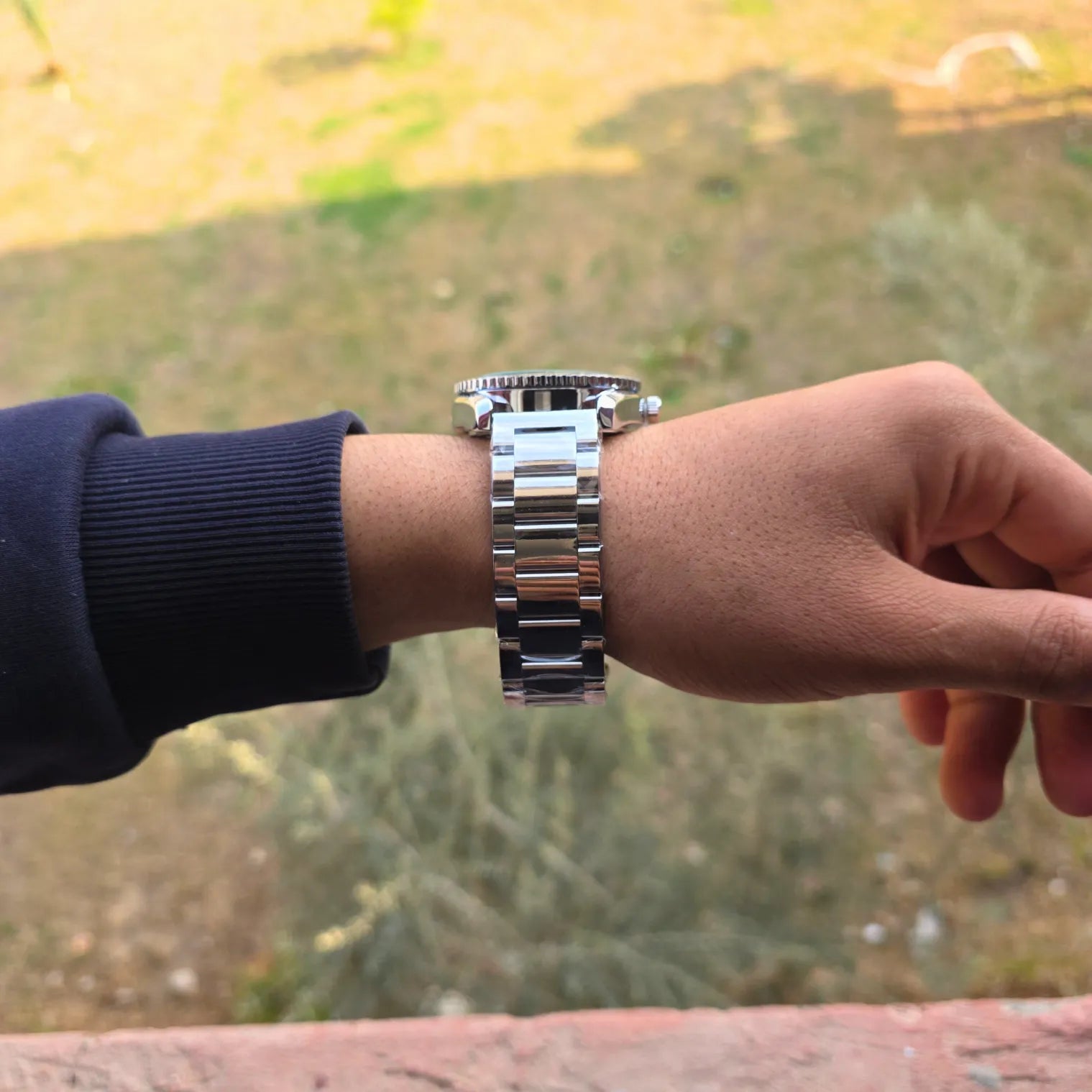 مصنوعة من الستانلس ستيل عالي الجودة مع سوار معدني بلمعة فاخرة، ومزودة بعرض التاريخ لسهولة الاستخدام اليومي. تعمل بـ ماكينة كوارتز (Quartz) دقيقة وعملية تناسب الاستخدام اليومي بثقة.
